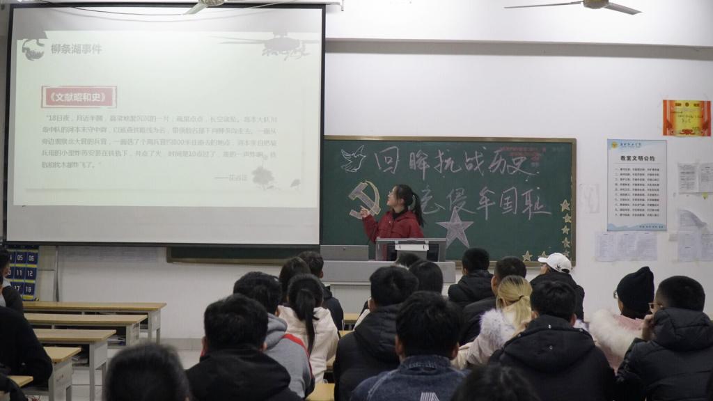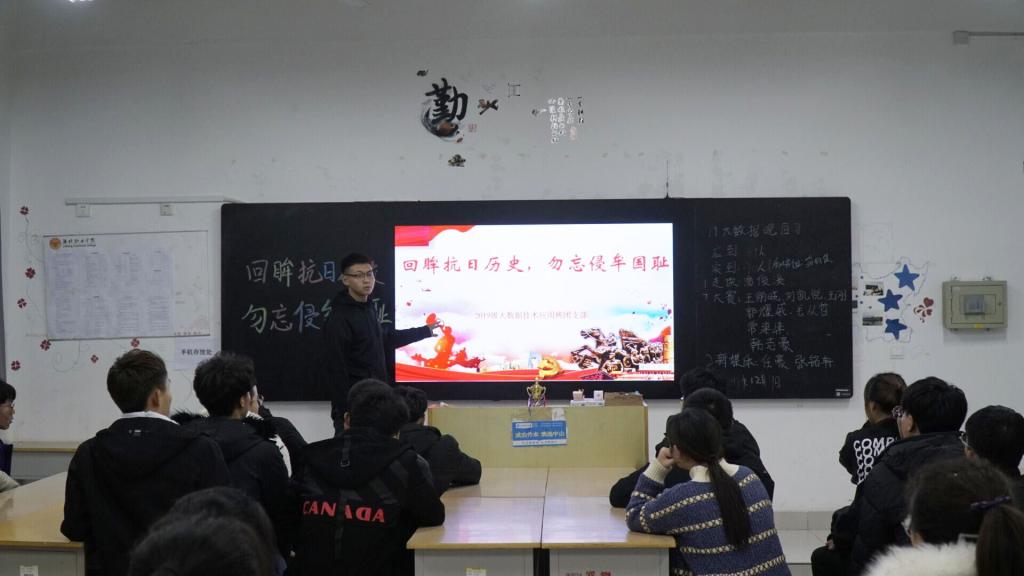 本次活动以班级为单位陆续展开。活动初期,学院各班级统筹安排、积极组织策划“回眸抗日历史,勿忘侵牟国耻”主题团课相关内容。活动中,各班级负责人利用相关视频、特色板报、PPT等形式展现了抗日战争时期烈士们英勇抗日、顽强奋战的场景,一幕又一幕令人心痛的侵华历史画面让同学们深感悲痛,更加体会到国家危难时刻中国人民的理想与担当。团课最后,各班就抗日历史展开激烈的讨论,纷纷抒发了自己对祖国的认识和热爱,让同学们意识到作为当代的新青年所肩负的历史使命,同时也深刻认识新时代大学生应该不忘初心,奋勇向前。