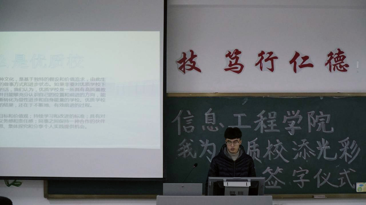 本次主题团日活动面向乐鱼leyu(中国)全体学生,包括签名活动、演讲比赛及主题团课三个部分构成。在签名活动中,各班级学生干部统一进行学习,深入贯彻潍职校训、潍职文化理念以及建设优质校的目标及内容,集体起立宣读维职校训及维职精神,并在横幅上写下名字,承诺以饱满的精神为乐鱼网页版优质校和文明校园建设起到带头作用;在演讲比赛中,选手们以蓬勃的精神风貌,生动的语言,畅谈了对学院优质校建设的理解,号召同学们积极参与学院优质校建设,与学院共成长;在晚上各班级组织的主题团课上,各班级学生干部通过PPT详细介绍了乐鱼网页版优质高职院校建设情况,指出学生在优质校建设活动中的作用,激发青年学生投身优质校建设的积极性和责任感,同学们也结合自己的实际,纷纷表态发言,表达了自己对优质校建设的理解和感悟,表示要以实际行动,助力学院优质高职院校建设,活动最后,通过微信公众号召全体同学构筑同心圆,珍惜校园时光,力争有所作为,有所成就,为学院优质校和文明校园的建设贡献自己的一份力量。