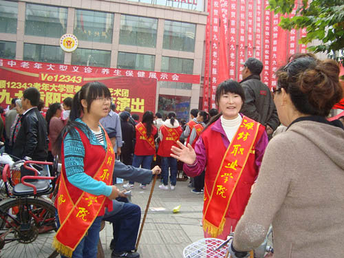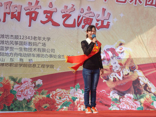 10月21日上午,他们又来到潍坊市风筝国际广场,为参加潍坊12343老年大学九九重阳节文艺演出和前来观看节目的老人献爱心。志愿者们的到来,使老人们非常高兴。同学们为老人们送上精心准备的爱心节目,同时与老人谈心、帮助搀扶老人、帮老人看管物品、整理和维护现场秩序,整个活动的开展组织有序,得到了老年大学和现场观众的好评。